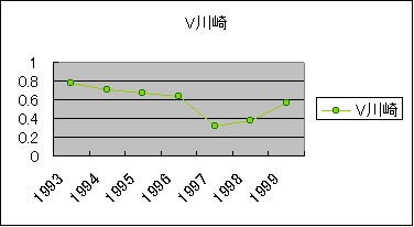 上昇したクラブはG大阪の1996年の0.367から1997年の0.625。下降したクラブはV川崎の