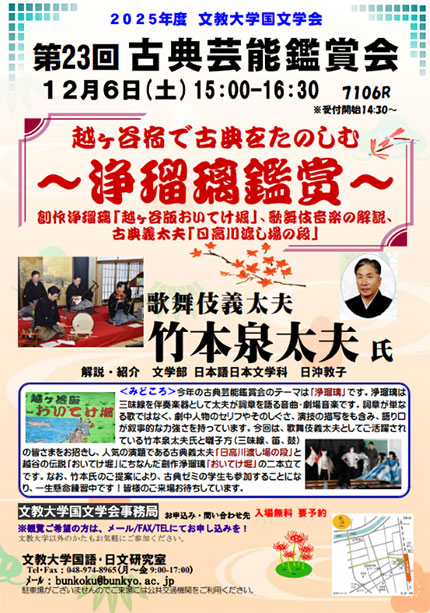 文教大学国文学会では2025年度の「古典芸能鑑賞会」を開催いたします。どなたでも参加いただけますので、お気軽にお越し下さい。