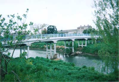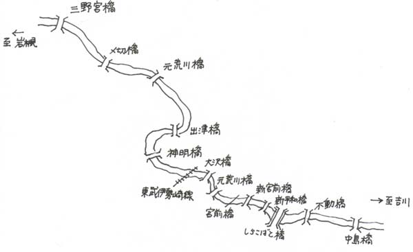 当時 丸太、石の足場――→木橋──→石橋──→鉄橋 現在