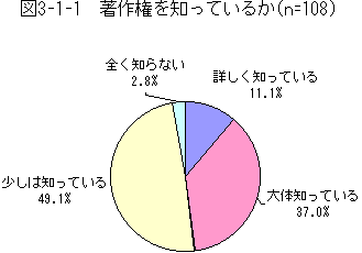 図3-1-1はその結果である。TVや新聞などでも取り上げられることが増えたこともあり、約97%が著作権を「知っている」と回答している。さらに、1割は著作権について「詳しく知っている」と答えている。