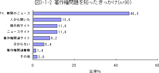 続いて、インターネット上での著作権問題を知っていると回答した人だけに限定して調査した。まず、インターネット上で著作権が問題になっていることを知ったきっかけは何だったかを図3-1-2に示す。