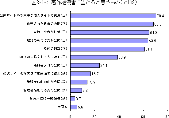 特に、「友達にCDから録音したMDを渡す」ことや、「携帯電話の着信メロディとして、許可を得ずに曲をインターネット上に公開する」ことを著作権侵害だと認識していないケースが多くみられた。これらは、日常的に行われてしまっていることであったり、普段良く使用していたりするために著作権の侵害であることに気がついていないのではないかと考えられる。