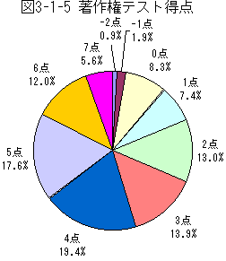 図3-1-5では著作権テストを点数でみてみる。このグラフでは、著作権テストの全体の点数を示している。全体の得点は約3.4点が平均であった。満点が7点であるので、ちょうど半分くらいの点数になっている。
