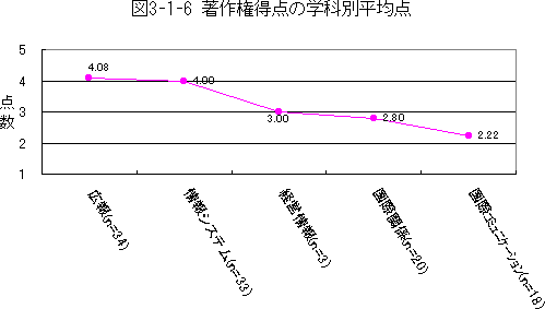 図3-1-6は学科別にみる、著作権テストの平均点である。これをみると、メディアを扱っている広報学科、パソコンを始めインターネットに関することも扱っている情報システム学科の理解度が高くなっている。