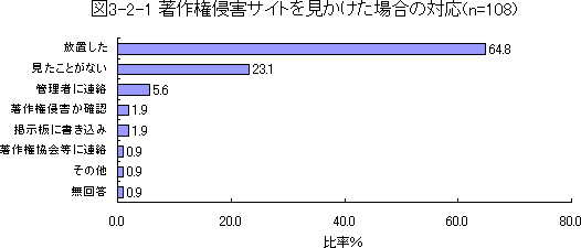 まず、著作権を侵害している(と思われる)サイトを見かけたとき、どのような行動を取ったかを図3-2-1に示す。殆どが侵害サイトだと気がついても、そのまま放置するという回答である。