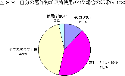 ほとんどは営利目的は不愉快であると感じていたり、全ての場合で無断使用は不愉快だと感じていたりするという結果が出た。自分の著作権が侵害されることに対して、特に気にしていないとか、使用されることは嬉しいという回答は約7分の1ほどであった。