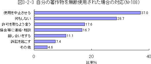 図3-2-3は自分の著作物が無断で使用された場合の対応(行動)である。何かしらの行動を起こすという回答が一番多いが、何もしないで放置するという回答も多い。