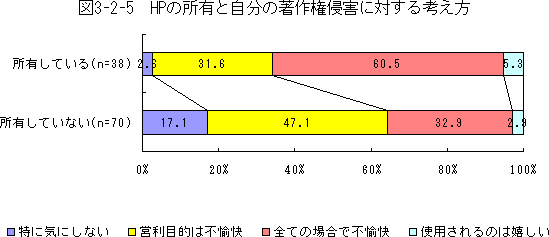 図3-2-5をみてみると、ホームページを所有していない人は自分の著作物が無断で使用されていた場合、特に気にしていなかったり、気にしても営利目的の場合だけだったりすると言う結果になっている。しかし、ホームページ所有者の場合は、圧倒的に全ての場合で不愉快だと感じる割合が高い。