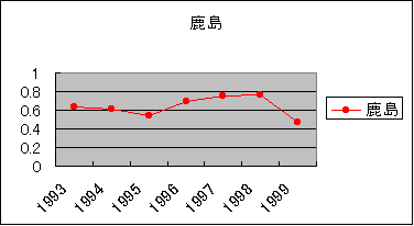 を抽出する。それは勝率が高かったチームは平均0.639で鹿島、低かったチームは平均0.287で福岡。