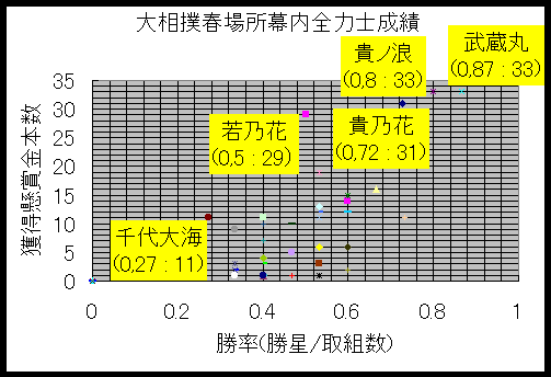 11年度)の6場所分を検証してみる。勝星と懸賞金について、幕内の全力士の成績を図で表してみる。[5] 懸賞金が、幕内の力士にとって大きいものかを表してみる。縦軸は懸賞金獲得本数、横軸は勝率(勝星/取組数)である。ここでは全力士のデータを点で示す。場所毎で特徴ある力士を取り上げる。その力士の点には四股名、勝率と獲得懸賞金本数の数値を付した。懸賞金のデータ