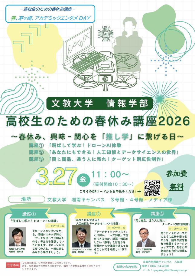3月27日(金)湘南キャンパスにて新高校2・3年生を対象とした高校生向け体験講座「春、茅ヶ崎、アカデミックエンタメDAY」を開催いたします!