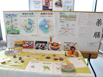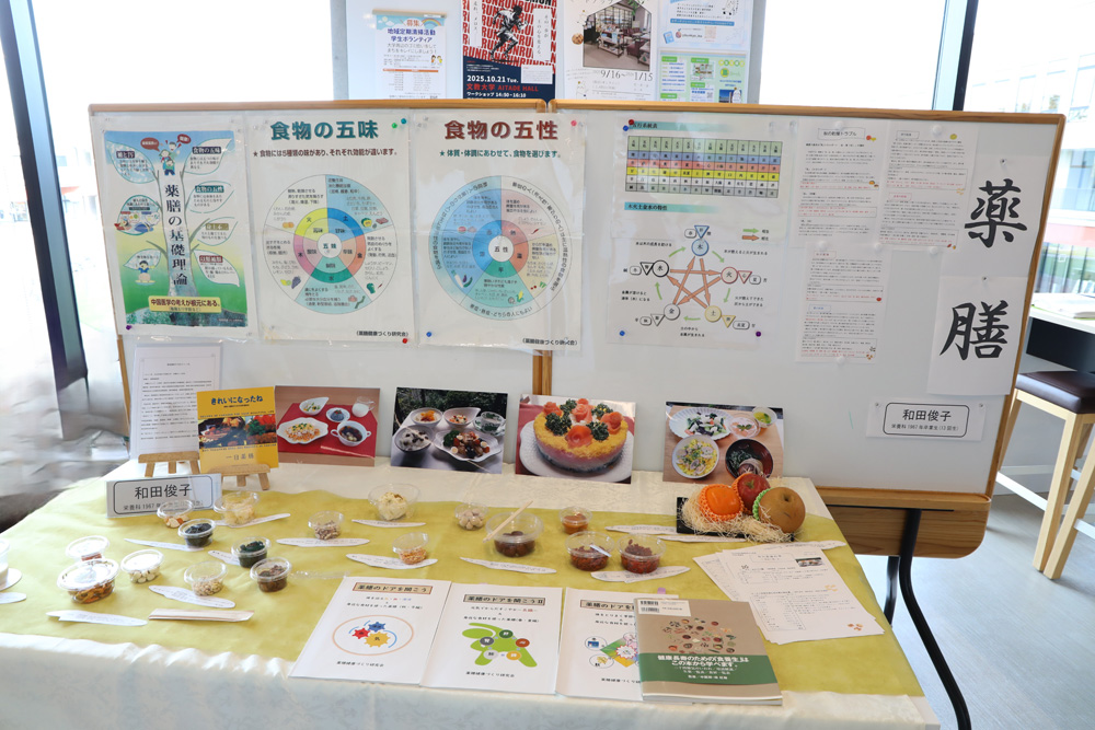 展示では、なつめ・クコの実・桑の実・ぎんなん・松の実・ゆり根・白きくらげ・梨・柿・りんご・豆乳など身体を潤す食品や肺を潤す食品、からだを温めるくるみや気の巡りを促す手作り陳皮など、身近な食品の薬膳的な効能を紹介しました。