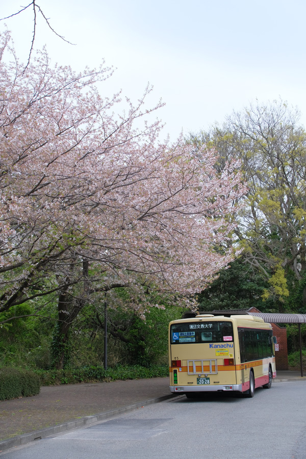 【 バスロータリーに咲く桜と生徒を待つバス 】