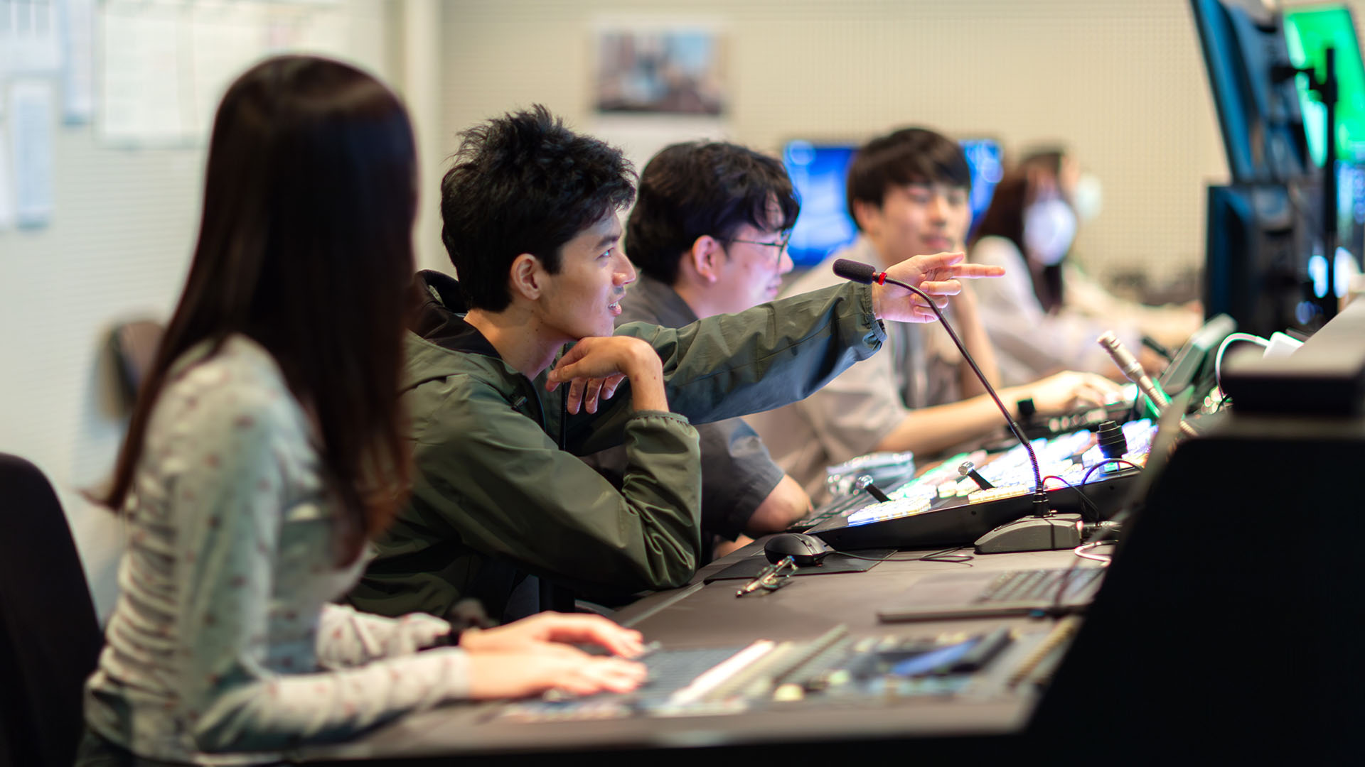 撮影には4K60P対応の高画質スタジオカメラ3台に加え、ジブクレーン搭載カメラ1台を使用し、多彩でダイナミックなカメラワークに対応します。音声設備は、有線・ワイヤレスマイク、ドリーブームマイクを常設し、最大54ch対応のミキサーに接続。照明は30chの調光卓に加え、LED照明も完備しています。
