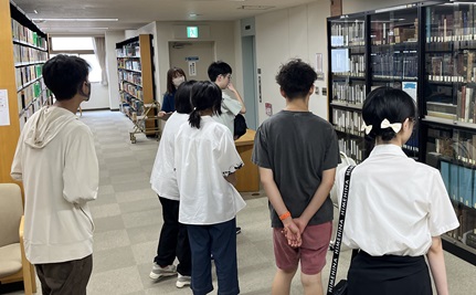当日は、猛暑の中、元気に児童生徒の皆さんが来校され、図書館では小学生コースと中高校生コースに分かれて、職員さんのお話を伺いながら大学ならではの地下2階の「集密書架」を興味深く眺め、「児童室」(読み聞かせの部屋)や「ブラウジングルーム」(ゆっくり雑誌や新聞を読む部屋)、アクティブラーニングエリア(話し合いをする部屋)も本に触れながら楽しく見学しました(写真)。その後、12号館の大教室で授業の雰囲気を体験し、お昼には食券を買ってカウンターに並びランチを受け取って食べる「学生食堂」でのランチタイムも楽しみました。