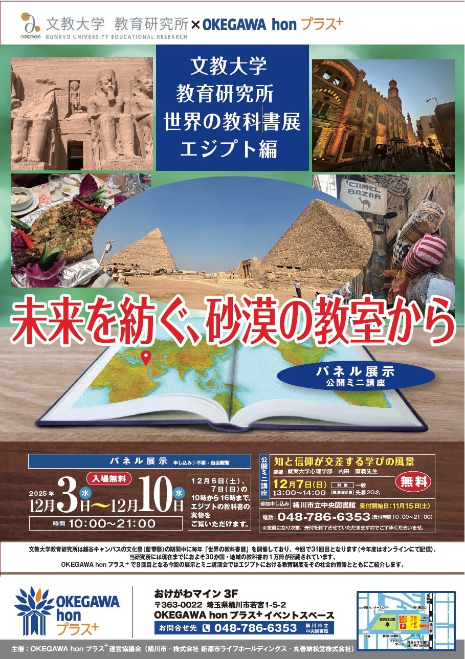 「世界の教科書展」を、埼玉県の桶川駅西口前にあるビルの文化・交流施設「OKEGAWA honプラス+」イベントスペースで開催します。12月7日(日)には公開講座も実施します。ぜひお越しください。