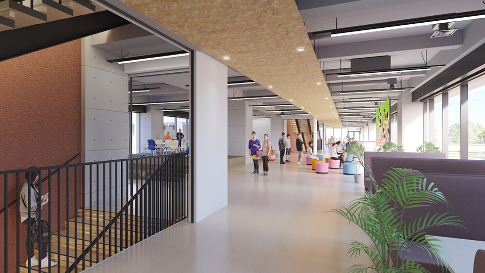 東京あだちキャンパスは、学生はもちろん、教職員、地域住民の方々など、多くの人に愛される開かれたキャンパスを目指して、周辺環境との連続性をテーマに設計。大学から街へ広がる学びの風景「ラーニングランドスケープ」を描く、3つの”わ”をデザインをします。