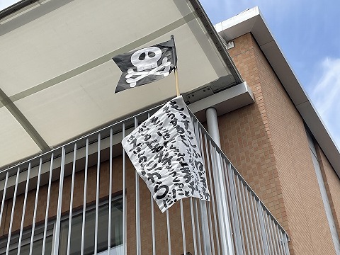 生活発表会(R6年2月)で使用した海賊の旗で1年生をお出迎え