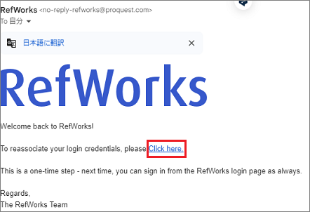 ② 自分のメールアカウントに届いたメール「Associate your RefWorks login credentials」の本文の「Click here.」をクリック