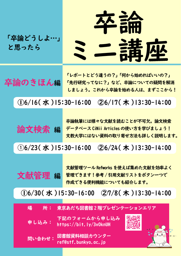 東京あだち図書館では6/16(水)から卒論ミニ講座を開催します。ぜひご参加ください!