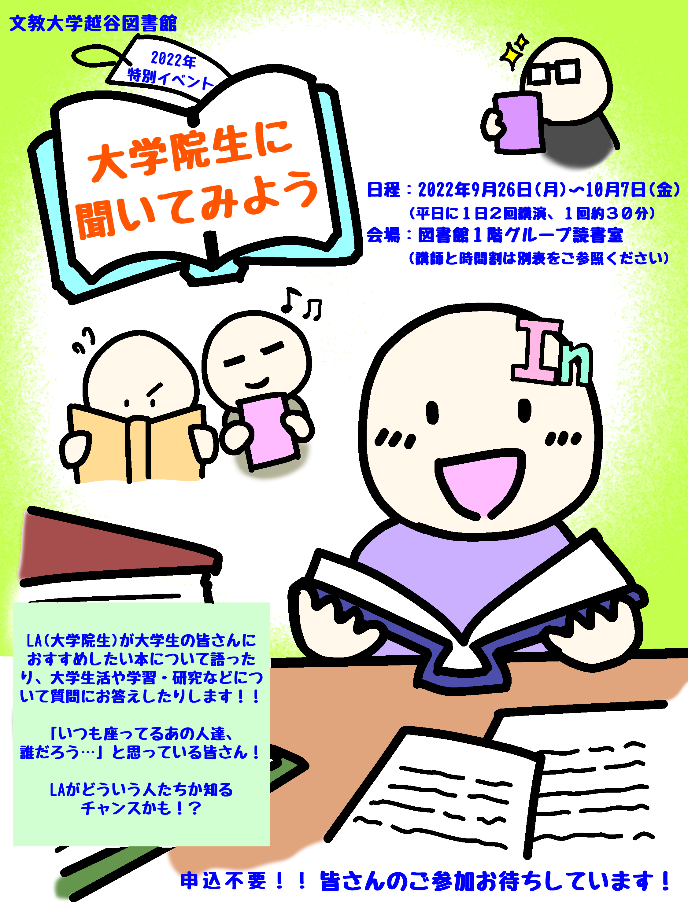 フリートークの時間もありますので、院生の生活や研究のこと、就活のこと、興味のある本のことなど、いろいろおしゃべりしてみてください。