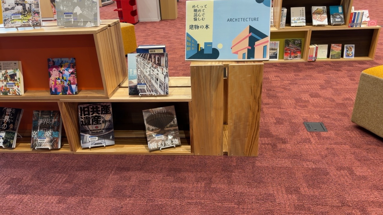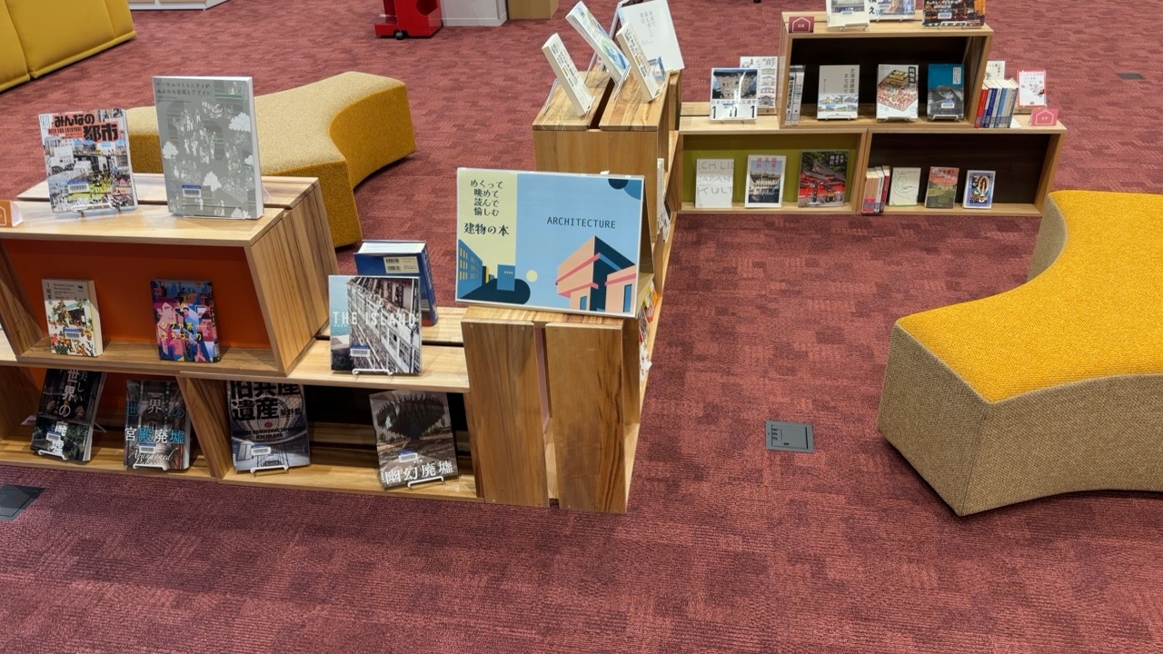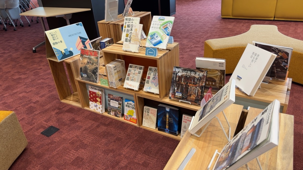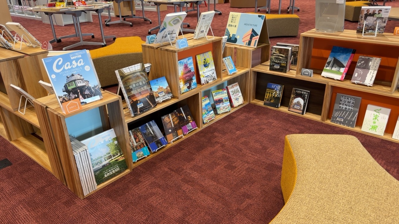 東京あだち図書館2階の企画展示コーナー、11月の図書館展示のテーマは『めくって、眺めて、愉しむ、建物の本』です。