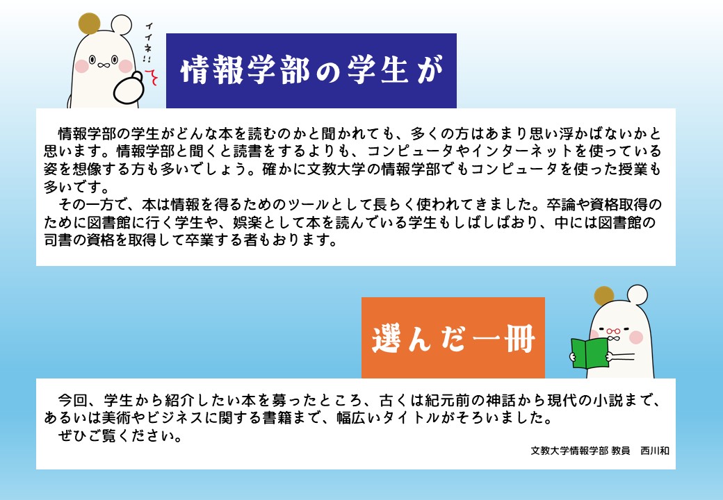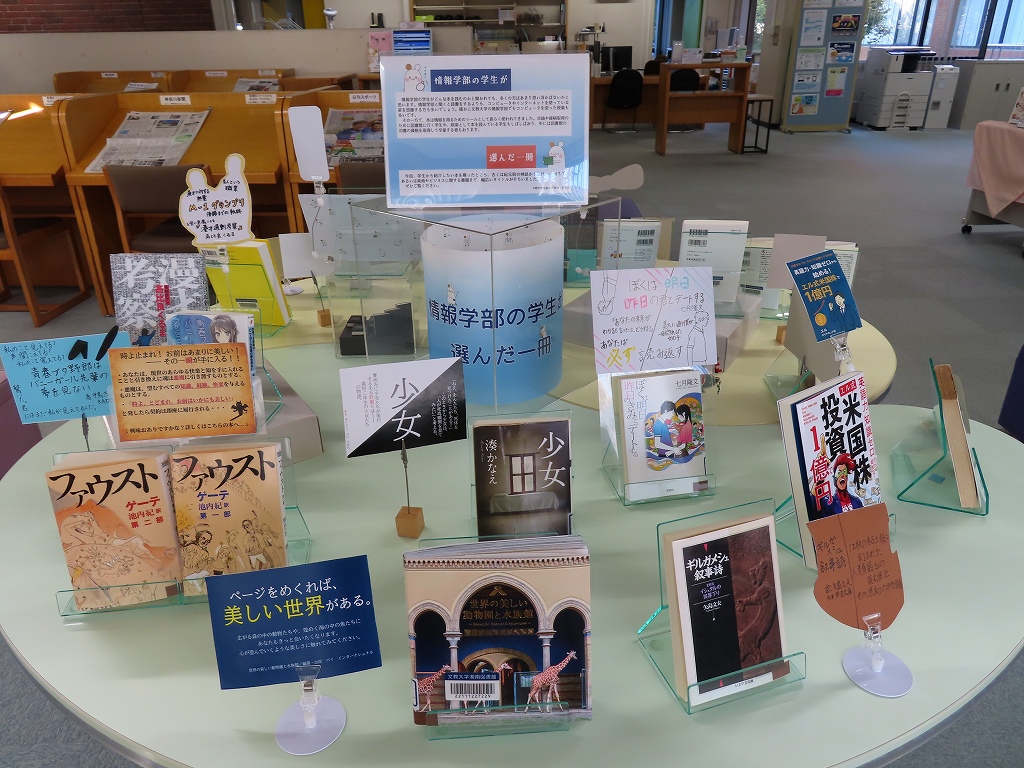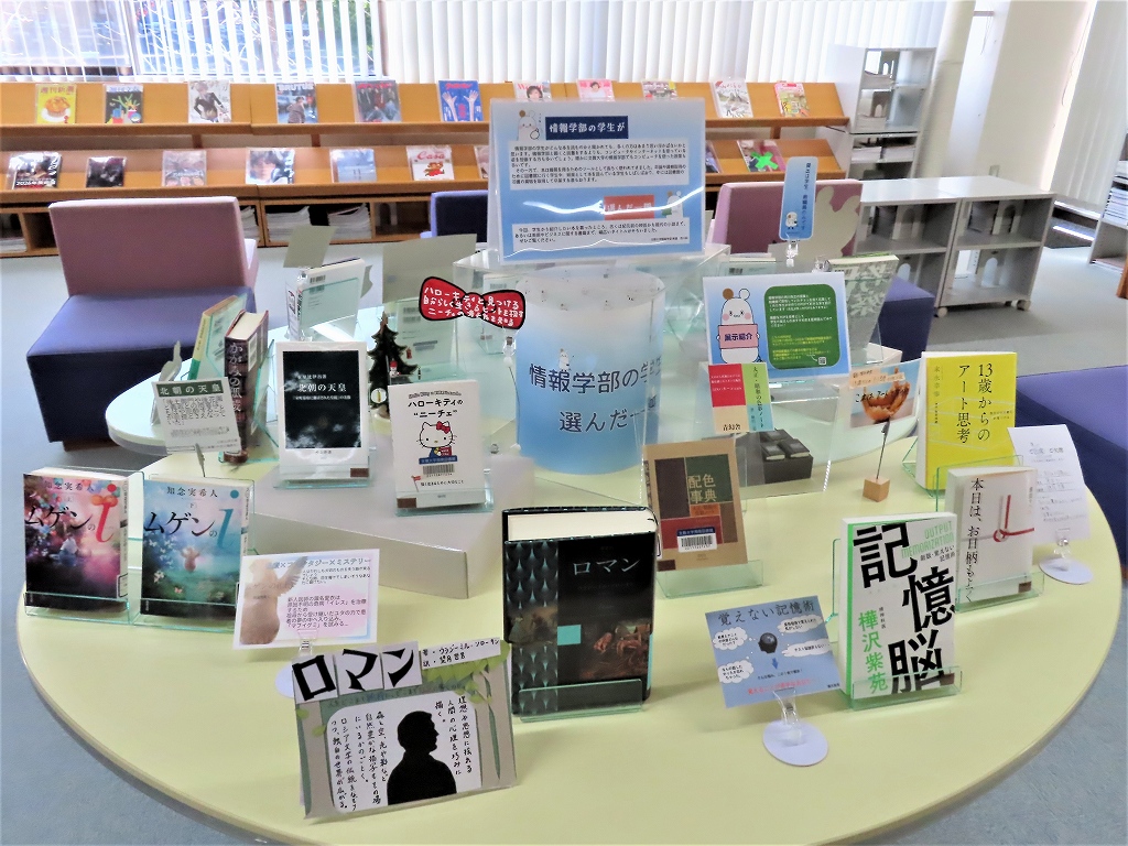 湘南図書館2F企画コーナーにて、「情報学部の学生が選んだ一冊」を展示しています。
