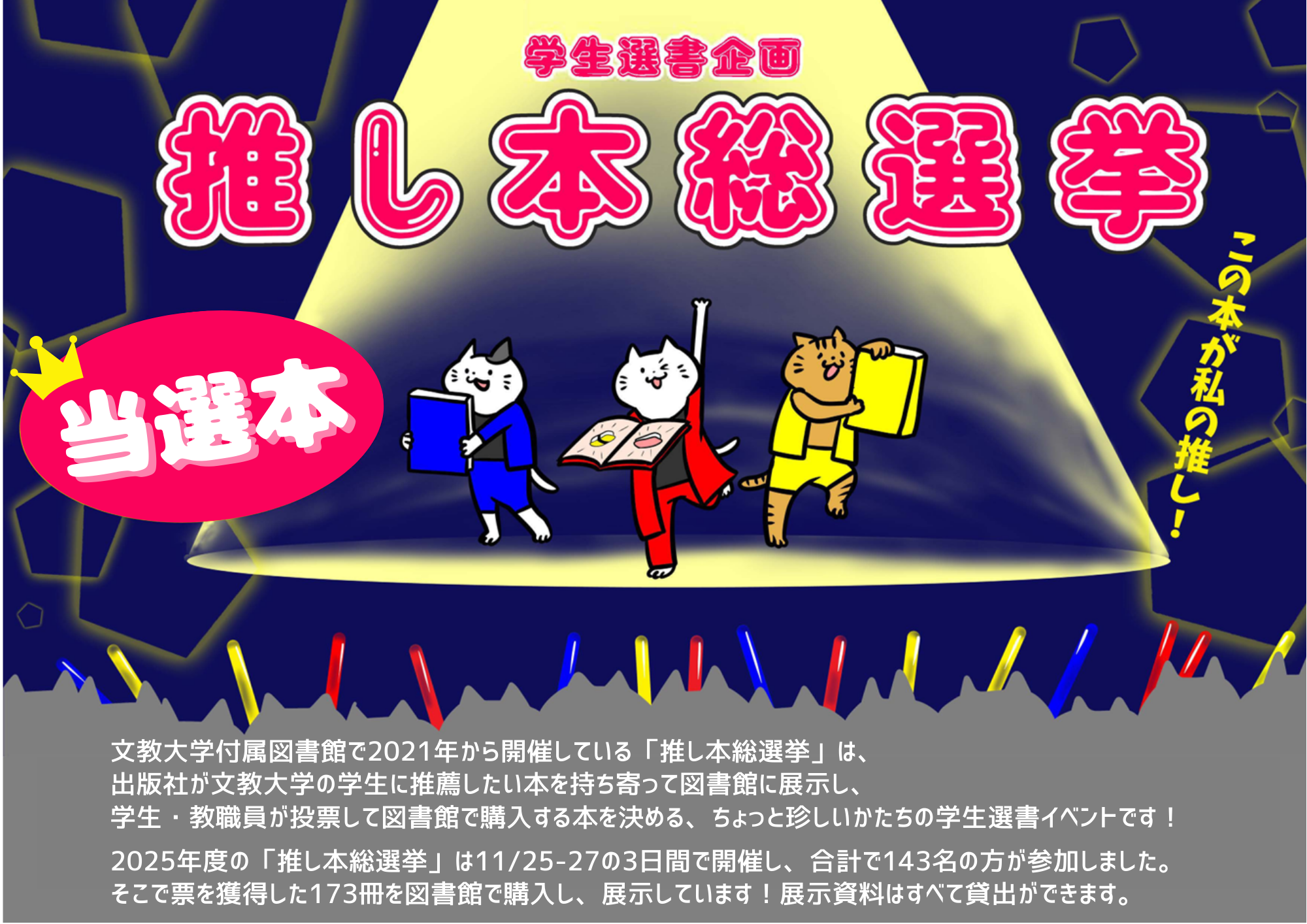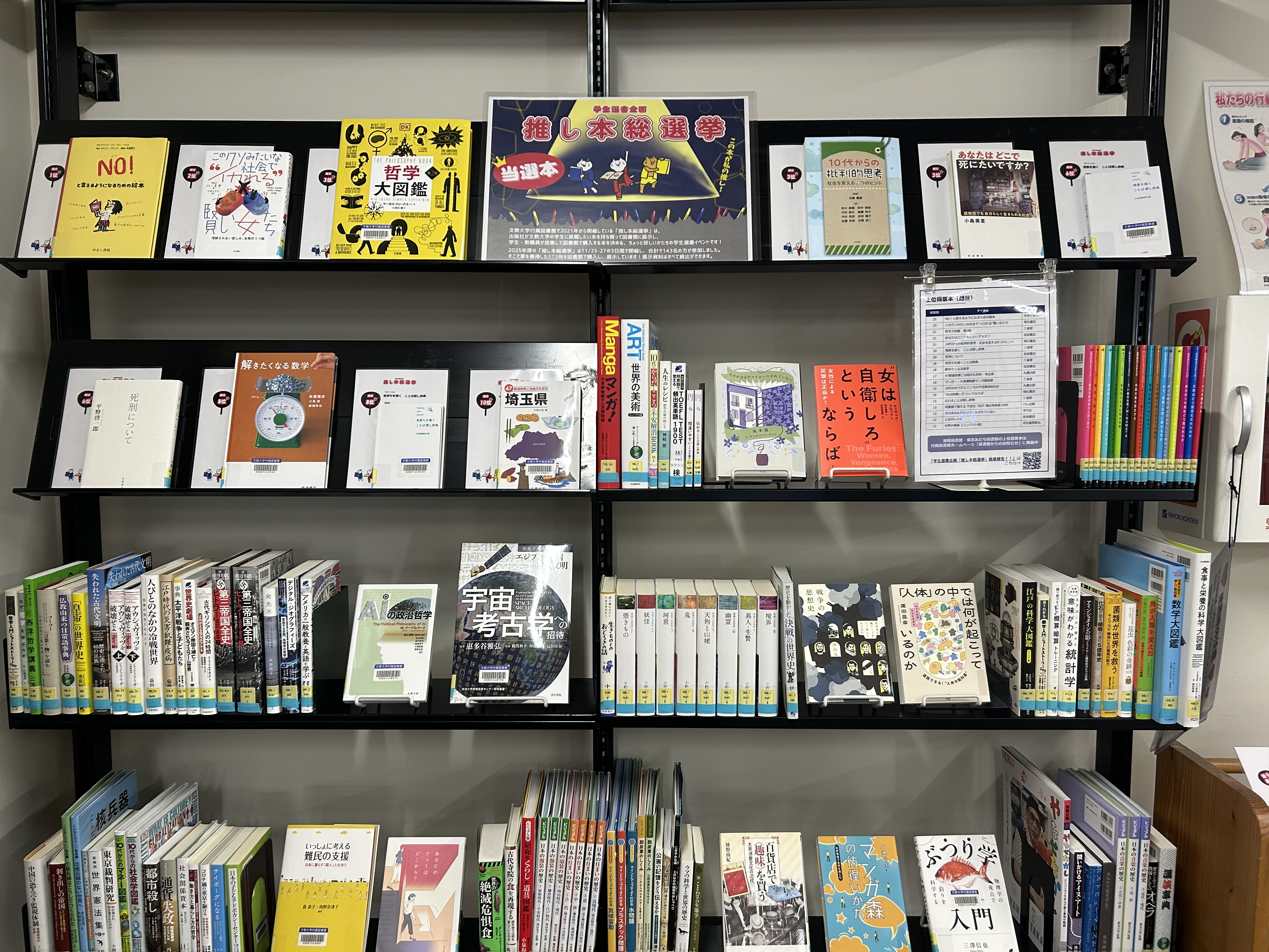 越谷図書館1階・入退館ゲート前で、2025年11月25日・26日・27日に開催した学生選書企画「推し本総選挙」の当選本の展示を開始しました!