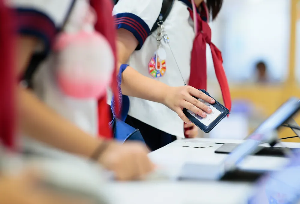 登下校時にPASMOやSuicaをタッチすることで、お子さまの通過情報を保護者へメール通知しています。