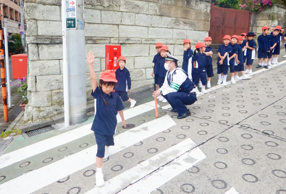 1学年の交通安全指導は、警察署の方に教えていただいたり、自然教室などの宿泊では、場所に合わせた行動を実践したりするなど工夫をしています。