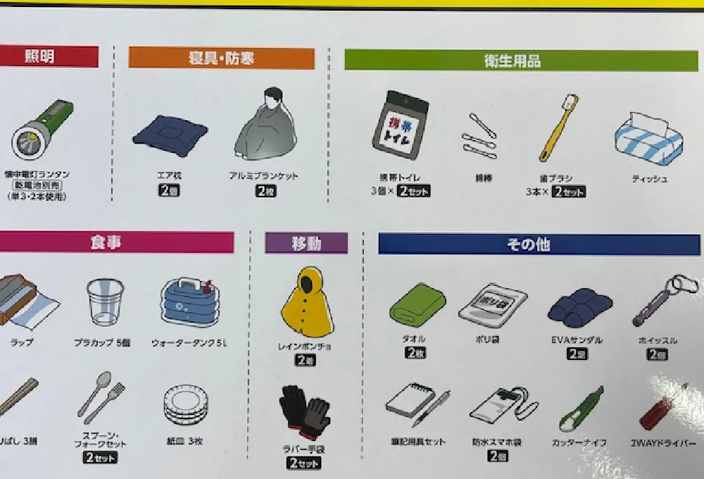 アルファ米や保存用パン、保存水、防寒・防暑用アルミシートや毛布、簡易トイレやブルーシート、救急処置用品、発電機と燃料等、保護者が引き取りに来るまで避難所で児童を預かることが出来るように体制を整えています。