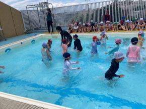 令和5年6月16日、一年生は初めて水泳教室を行いました。青空の下、少し冷たいシャワーに歓声をあげながら屋上プールに入りました。まずは、プールの中を歩いたり、ワニさんになったりしながら少しずつ水に慣れていきました。その後は、魚拾いや、水中じゃんけん列車などをして、とても楽しむことができました。 夏が、始まりました!