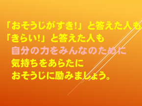 今回のズームでの島野校長先生のお話は、「みなさんはおそうじは好きですか?」という問いから始まりました。それぞれの教室からは「好きです!」「は~い」という声があがる一方、「ちょっと・・・」「う~ん」といった声もありました。そこで、島野校長先生は、掃除はとても素敵な日本の文化であると紹介していただき、掃除は礼儀やマナーであることや、自分自身の心をきれいにしてくれるという話を教えてくださいました。そのほかに、「なぜほうきを使うのか」と実はほうきが始めは神聖な存在であったということも話してくださいました。文教大学付属小学校の子どもたちの、おそうじにも何事にも懸命に向かえる素敵な気持ちをこれからも、もち続けてほしいと思います。