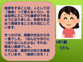 Zoomでの全校朝礼で島野先生は、「先日、そうじをされている方から、とてもいいお話を聞きました。」と話され「それは、みなさんの挨拶がとてもよかった。と、いう話でした。」と伝えていただきました。子どもたちはとてもうれしいお話で、すこし照れくさそうに話を聞いていました。文教大学付属小学校は気持ちのよいあいさつが伝統であります。気持ちのよい挨拶は「心をつなぐ魔法の言葉」です。これからも、引き継いで、続けていってほしいと願います。