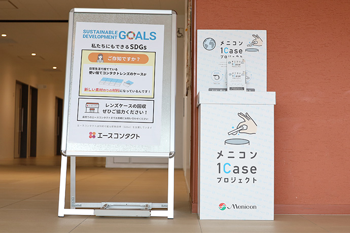 「メニコン1Caseプロジェクト」は、「エースコンタクト」を運営する(株)ダブリュ.アイ.システムが推進する使い捨てコンタクトレンズの空ケースを回収して再利用する環境プロジェクトで、サーキュラーエコノミー(循環型経済)の考え方に基づいて実施されています。東京あだちキャンパスへの設置は(株)ダブリュ.アイ.システム様からの提案で実現しました。