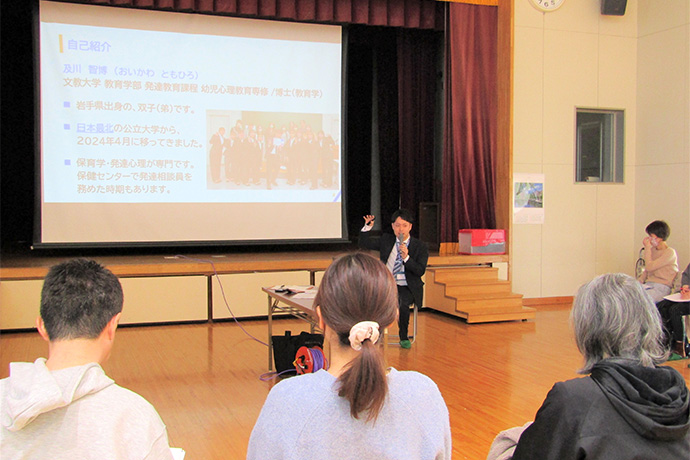 本学教育学部発達教育課程の及川智博講師が登壇し、育児の焦りを和らげるヒントを専門的かつ親しみやすい視点でお話しいたしました。
