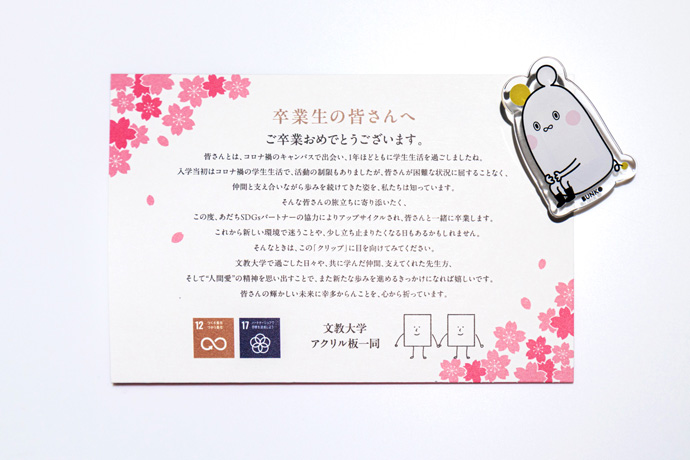 グッズ制作には、本学も登録するあだちSDGsパートナーの登録企業にご協力頂きました。この取り組みが卒業生にとって心に残る思い出となり、SDGsへの関心をさらに深めるきっかけとなることを願っております。