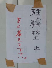 私も迷惑駐輪のシールをはられちゃ いました。シールを3枚集めると、撤 去というステキなプレゼントが! ほんっとよく考えて下さい! あ、でもこれはなぞなぞじゃないです よ。 |