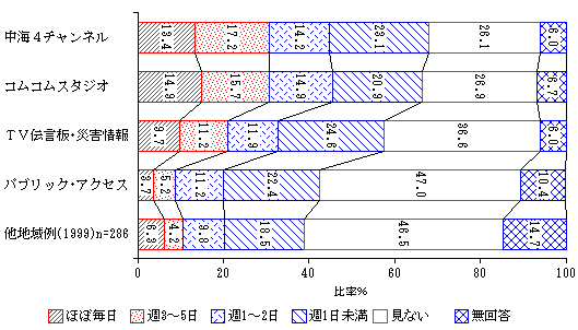 中海テレビ放送はコミュニティ番組の充実でよく知られているが、そこで放送されている中海4チャンネル、コ ムコムスタジオ、テレビ伝言板・災害情報、パブリック・アクセスの視聴状況を図3に示す。中海4チャンネルは毎日13%、週に1日以上45%、週に1日未 満も含めると7割弱で、同図に示している他地域例(八ッ橋1999)と比較すると、よく見られていることが分かる。